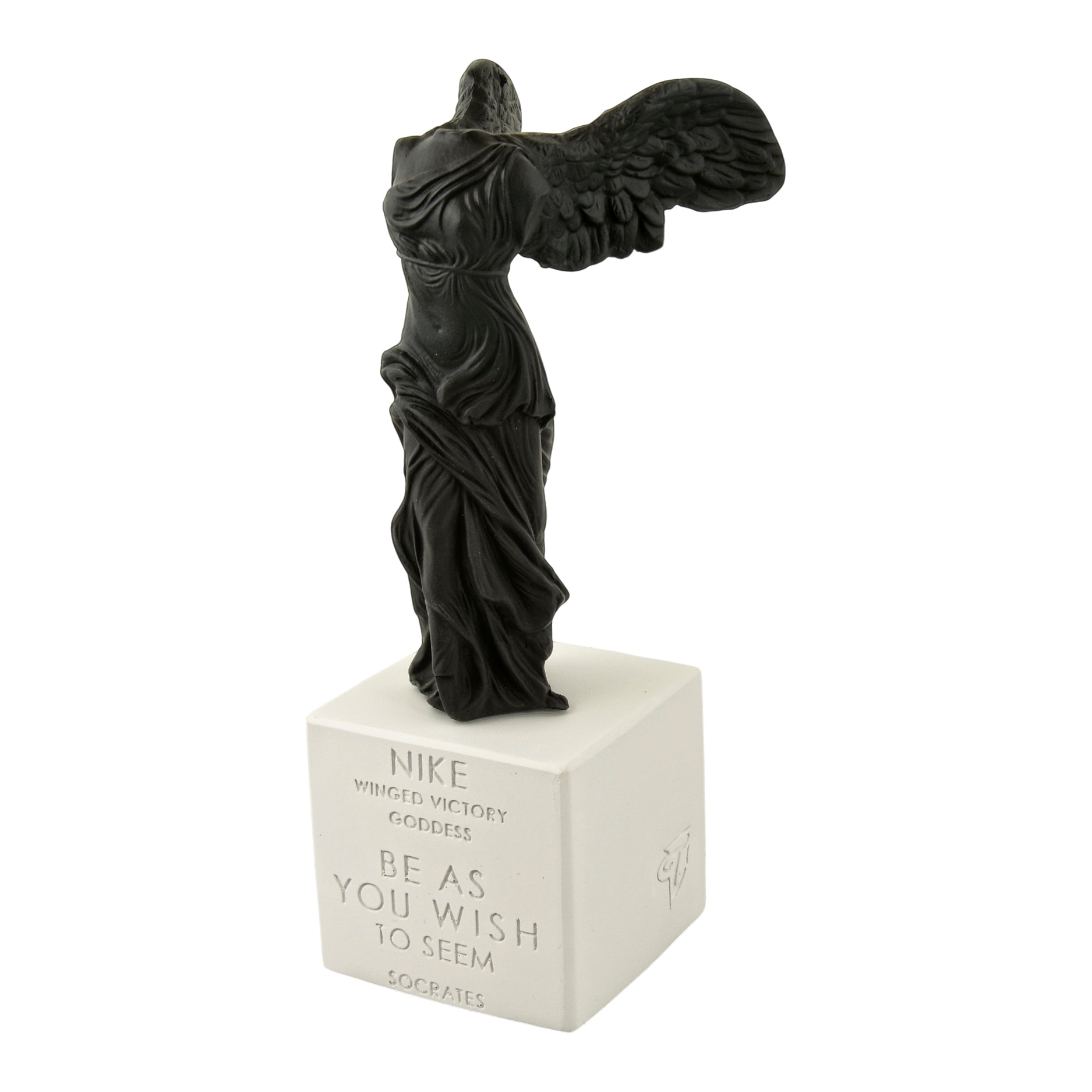 Coloured statue of Nike of Samothrace, the Goddess of victory. The prototype marble sculpture belongs to the Hellenistic period and was found in the sanctuary of the Great Gods in the island of Samothrace. It represents the winged Goddess Nike, who descends from the sky, to announce the victory of the fleet in a battle (210-190BC). Goddess Nike, in Greek mythology is the winged Goddess which symbolizes victory. Her special feature are the wings that spread triumphantly over the earthly world. In literature, the statue appears for the first time in the works of Hesiod, while its earliest representations date back to the first half of the 6th century BC. Nike was the daughter of Titan Pallas and Styx, while according to another tradition, she was the daughter of God Ares. She belongs to the first divine generation and is more Ancient than the Olympian Gods. Her personification was to bring and to announce victory. The statue is one of the most famous Ancient Greek statues, and is associated with a significant naval victory. It is not still specified with which naval victory it is connected to. Most probably though, it is connected to the fleet of Rhodes, after its decisive naval victories in 190 BC. The original location of the statue in Samothrace is known owing to excavations. The Goddess is dressed in a thin tunic touching her body, as she moves swiftly forward, forming thinner and thicker pleats elsewhere; while a thick cloak is wrapped around her limbs, leaving her left leg partially uncovered. The outstretched wings (of which only the left one survives today) also emphasize her intense movement. The exact position of the hands is not yet known, and therefore the representation of the statue remains incomplete. However, the worldwide admiration for the sculptural skills with which the statue is made, remains.