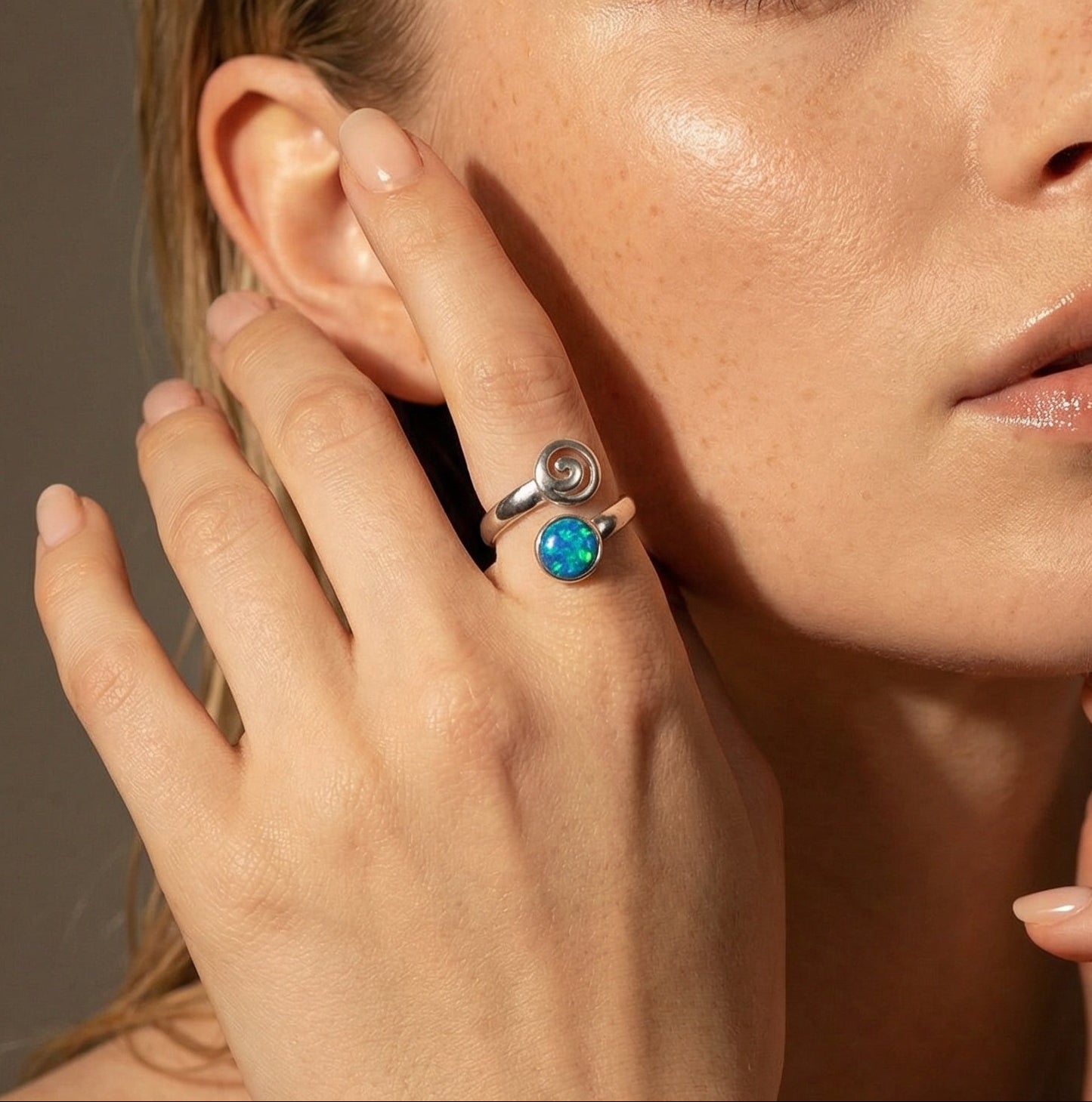 Adjustable opal stone spiral ring for both day and night smart look! The spiral has been a complex and powerful symbol since Ancient times. It symbolized vitality, movement and energy. It existed in myths, religious beliefs and legends.